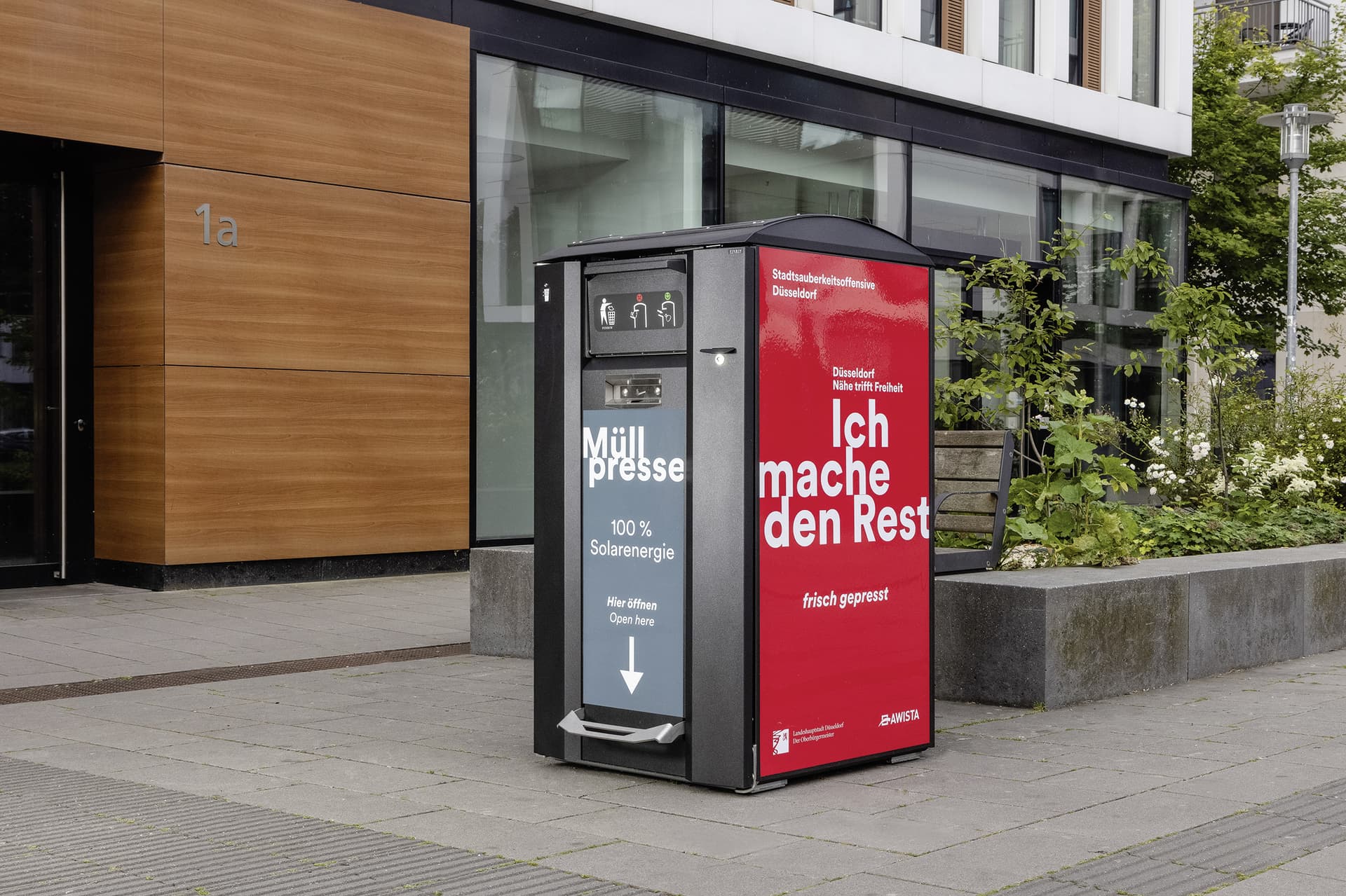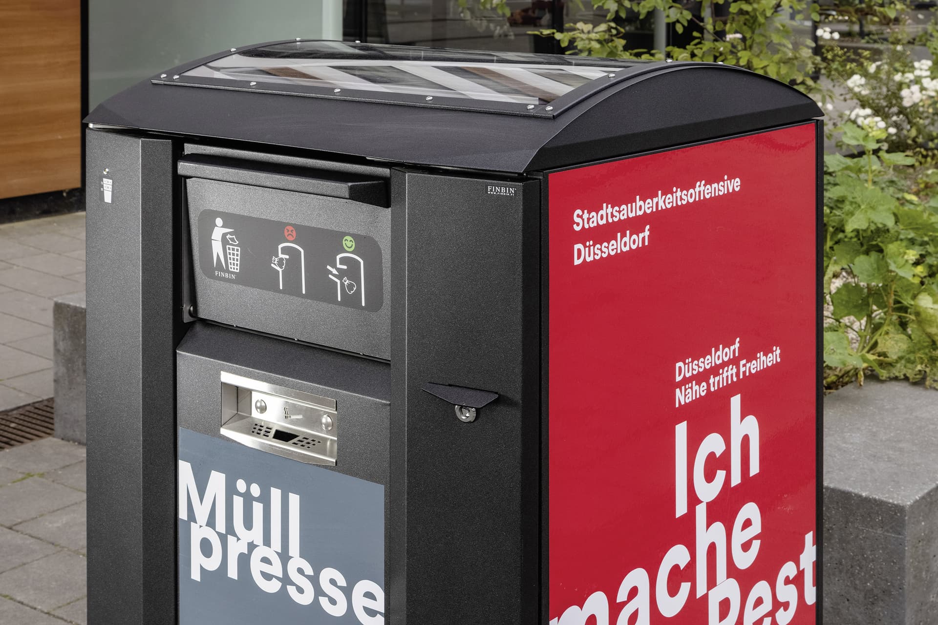 Der solarbetriebene Abfallbehälter CITYSOLAR verdichtet Abfälle automatisch mit patentierter Presstechnologie und erhöht so das nutzbare Volumen um ein Vielfaches. Das reduziert Leerungsintervalle, senkt Betriebskosten und vermeidet CO₂-Emissionen.